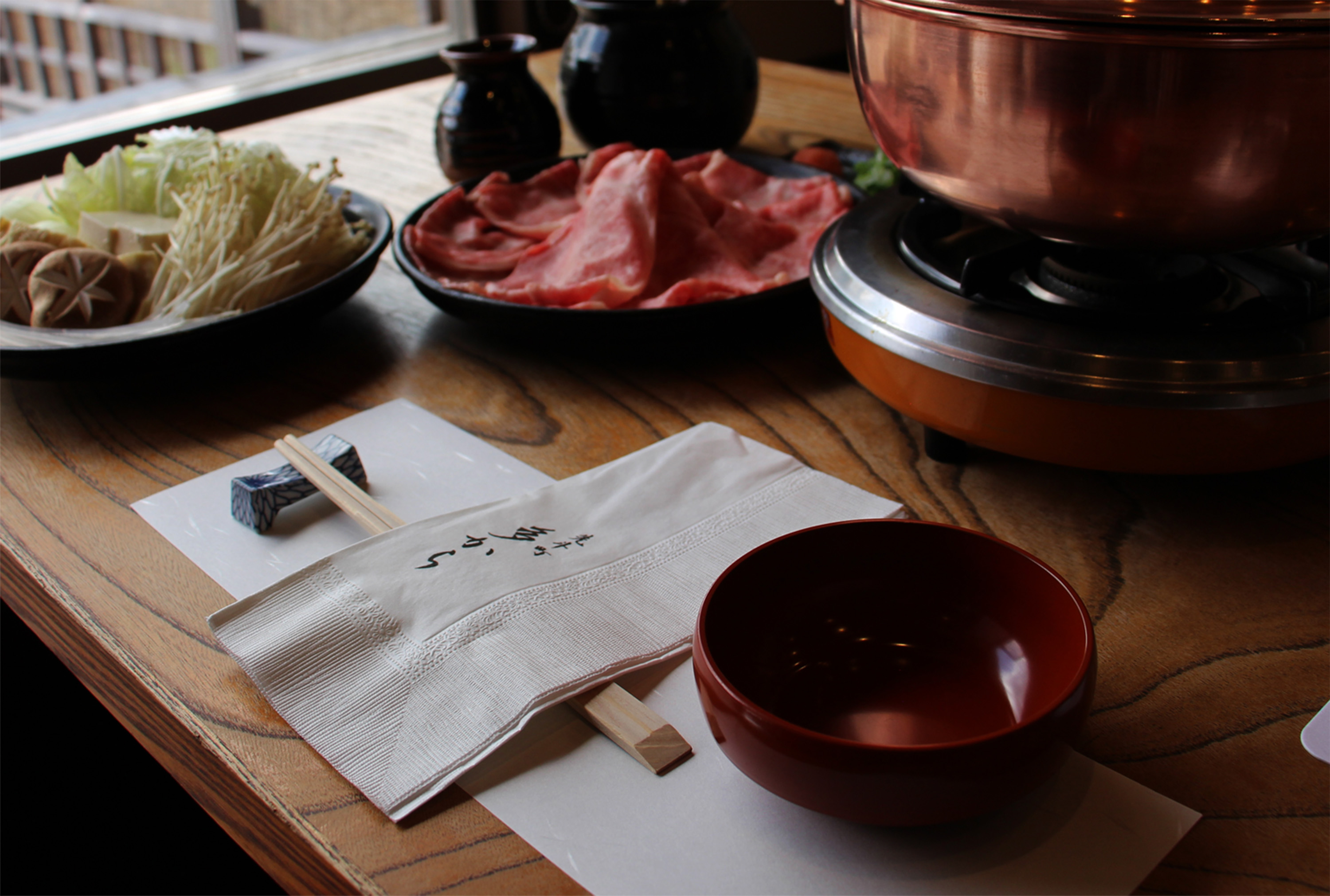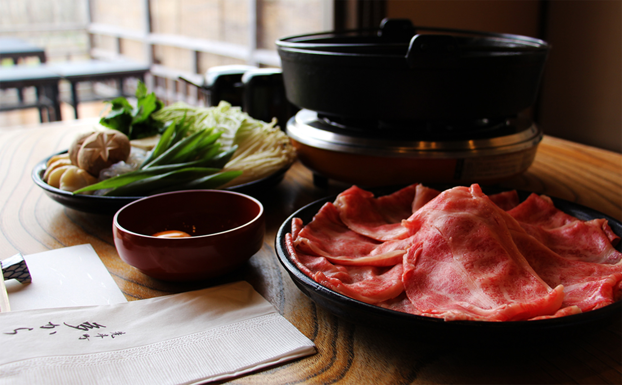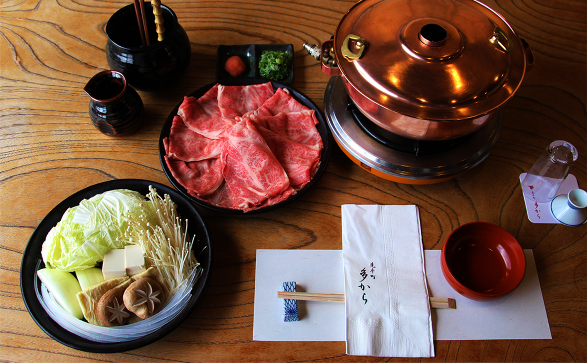 多から特製、京風割り下で頂く高級京都牛のすき焼きです。新鮮とき卵でお召し上がりください。